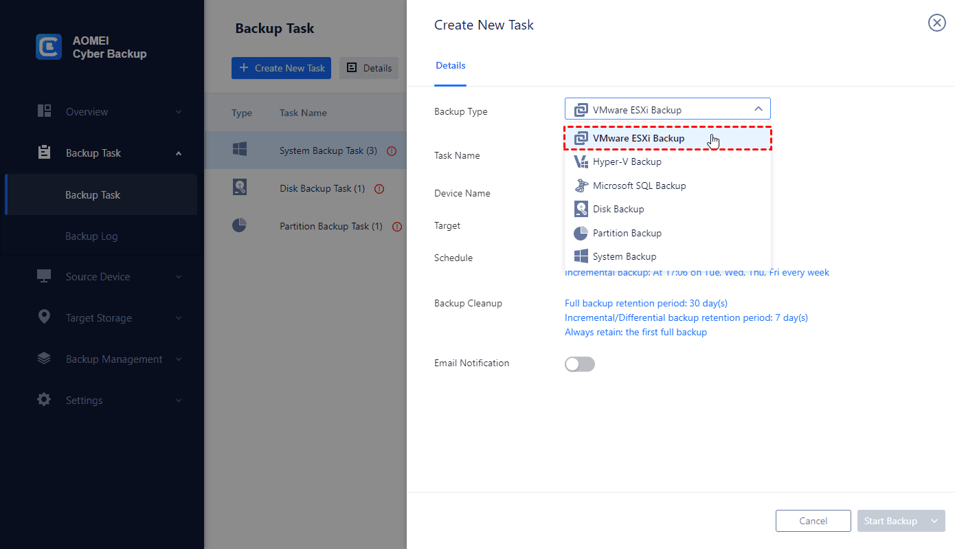 Learn how to backup VMware virtual machines using AOMEI Cyber Backup as follows: