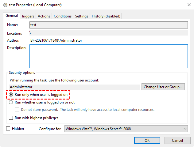 Step 6. Note that the Task Scheduler can access the mapped network drive only if the "Run only when user is logged on" option is enabled. If you want automatic file copying to a network drive, ensure this option is selected in the Properties window.
