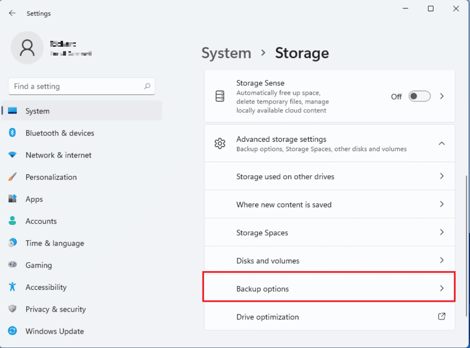 1. Press Windows + I to open Settings, select System followed by Storage, then click on Backup options.