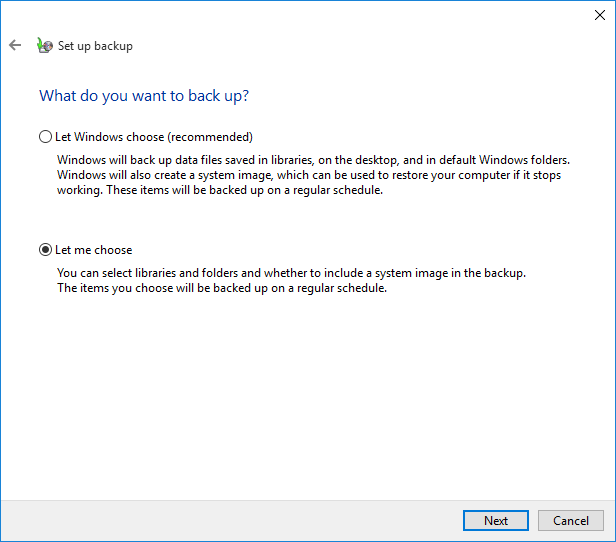 4. In the What do you want to back up window, select the Let Windows choose (recommended) option or Let me choose, click Next.