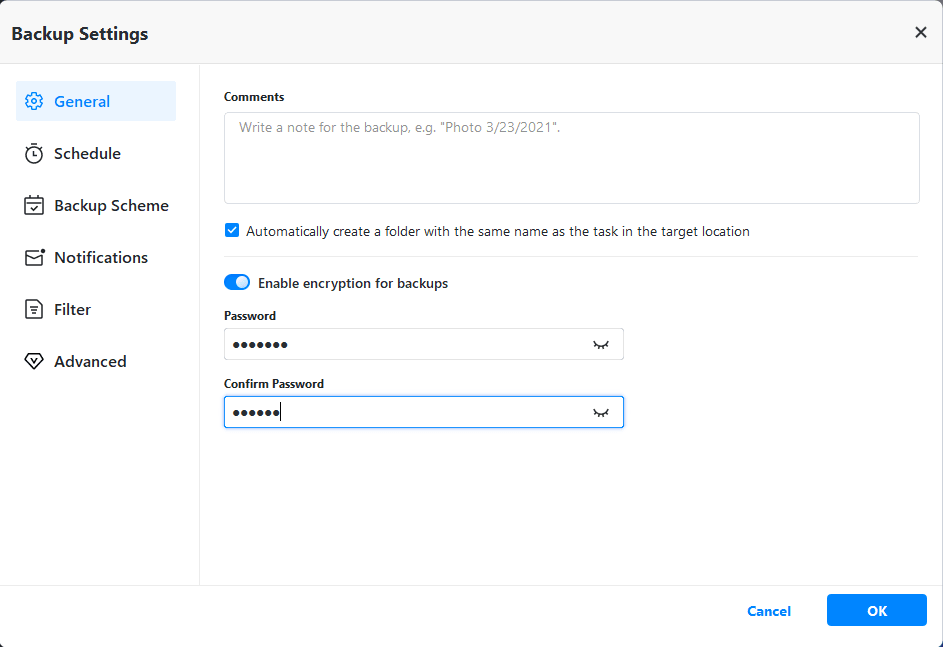 Step 3. To encrypt the selected data, click Options and turn Enable encryption for backups under the General tab. Then, you can type the password twice and click OK.