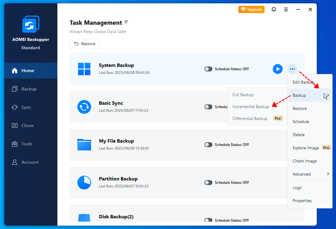 But if you are worried the incremental backup gets corrupted and causes data loss, you can choose to use differential backup. It can make compensate for this shortcoming in the incremental backup.