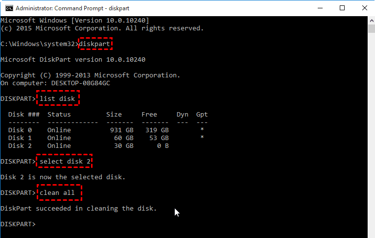 Step 3. When you see DiskPart succeeded in cleaning the disk, type exit to close the windows.