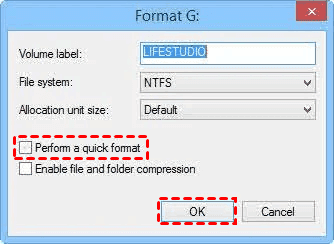 Step 3. On the pop-up screen, it is recommended to choose NTFS for File system and uncheck the Perform a quick format checkbox. Then, click OK.