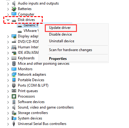 Step 2. Expand Disk drives and locate your SSD. Right-click on it, and select Update driver.