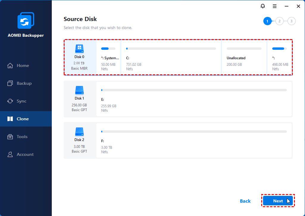 Step 2. Select the 2TB MBR disk as the source disk and then choose the 3TB GPT disk as the destination disk.