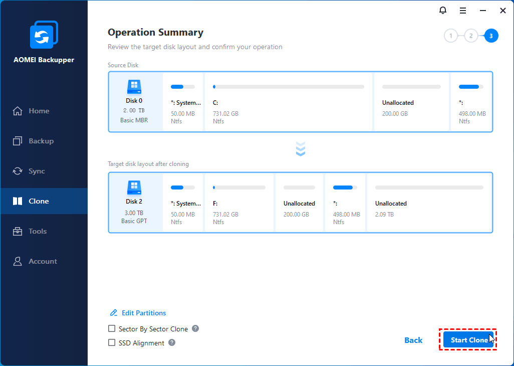 Step 5. Confirm the operations and click “Start Clone” to clone 2TB MBR to 3TB GPT. You can also use your computer during the cloning process.