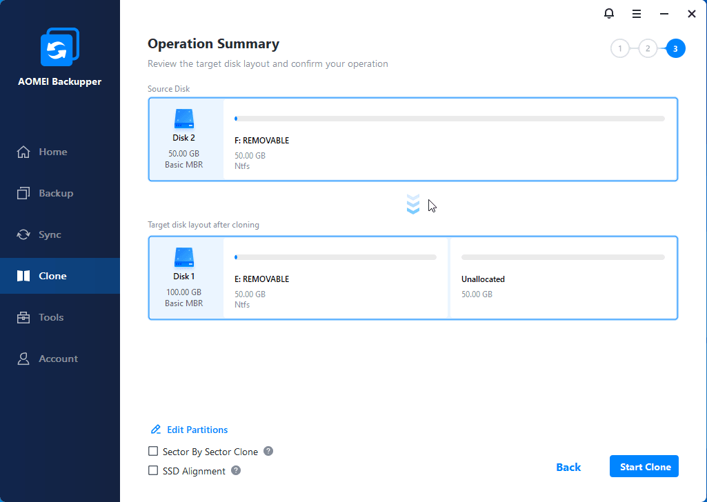 Step 4. Confirm the information of the source disk and destination disk. Then, click “Start Clone” to begin CF card clone.
