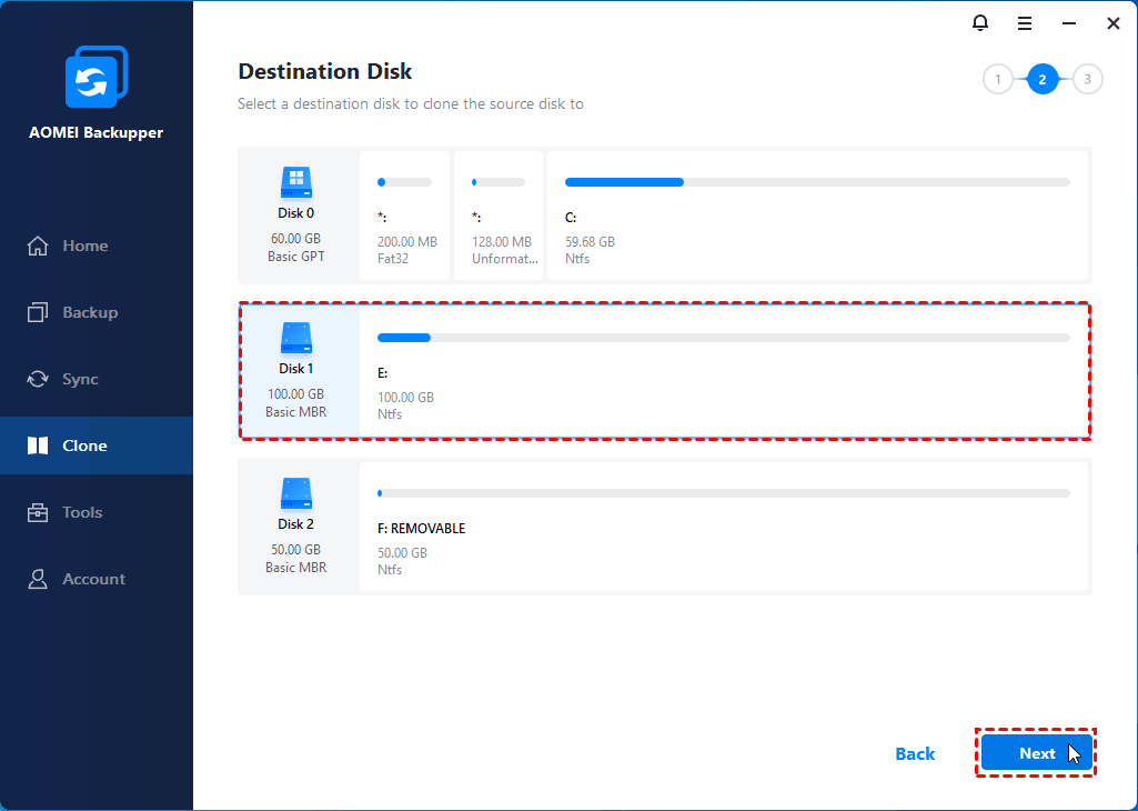 Step 3. Select the destination CF card where you plan to store the cloned data and click “Next”.