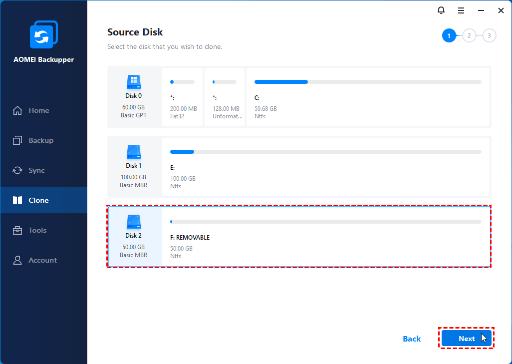 Step 2. Select the bootable CF card as the source disk and click “Next”.