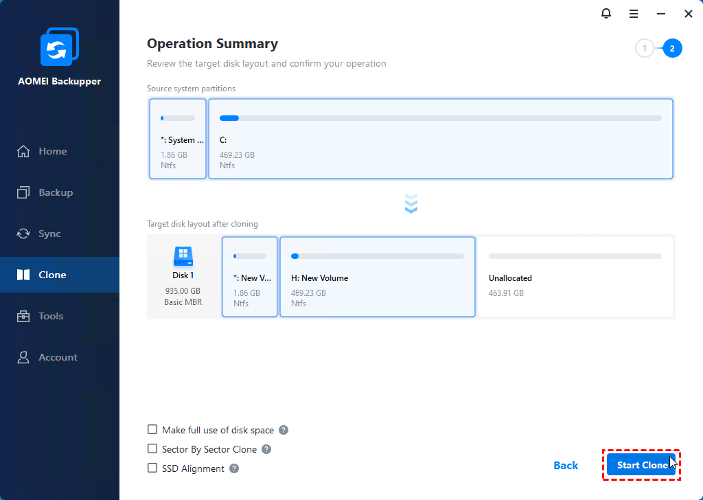 ◔ "Make full use of disk space": If your target disk is larger, you can add unallocated space to system partition automatically. Thus, you don't need to worry about low disk space issues.