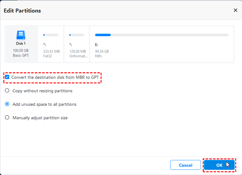 Also, you can use Sector by sector clone to keep the old partition layout or Edit Partitions to adjust the partition size on the destination disk. And the later one is more practical, since it resolves two potential issues during the cloning process.