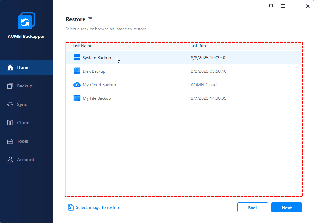 6. Once logged in, you’ll see AOMEI Backupper loaded. Click Restore, access the backup image, and then follow the on-screen guide to continue.