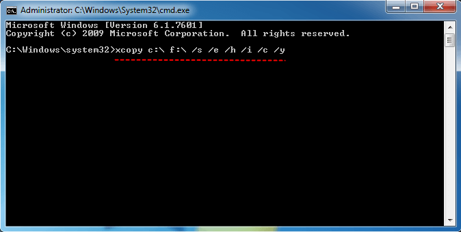 Step 2. Type xcopy c:\ f:\ /s /e /h /i /c /y and press Enter to copy all the files and subdirectories (including any empty subdirectories, any system or hidden files) from drive C to drive F. You may change the drive letters according to your own needs.