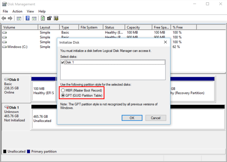 Launch Disk Management with the above mentioned steps -> right-click the disk you want to initialize and click "Initialize Disk" (If the disk is listed as "Offline", first right-click it and select "Online") -> select the correct partition style in the Initialize Disk dialog box, and then click OK to confirm it.