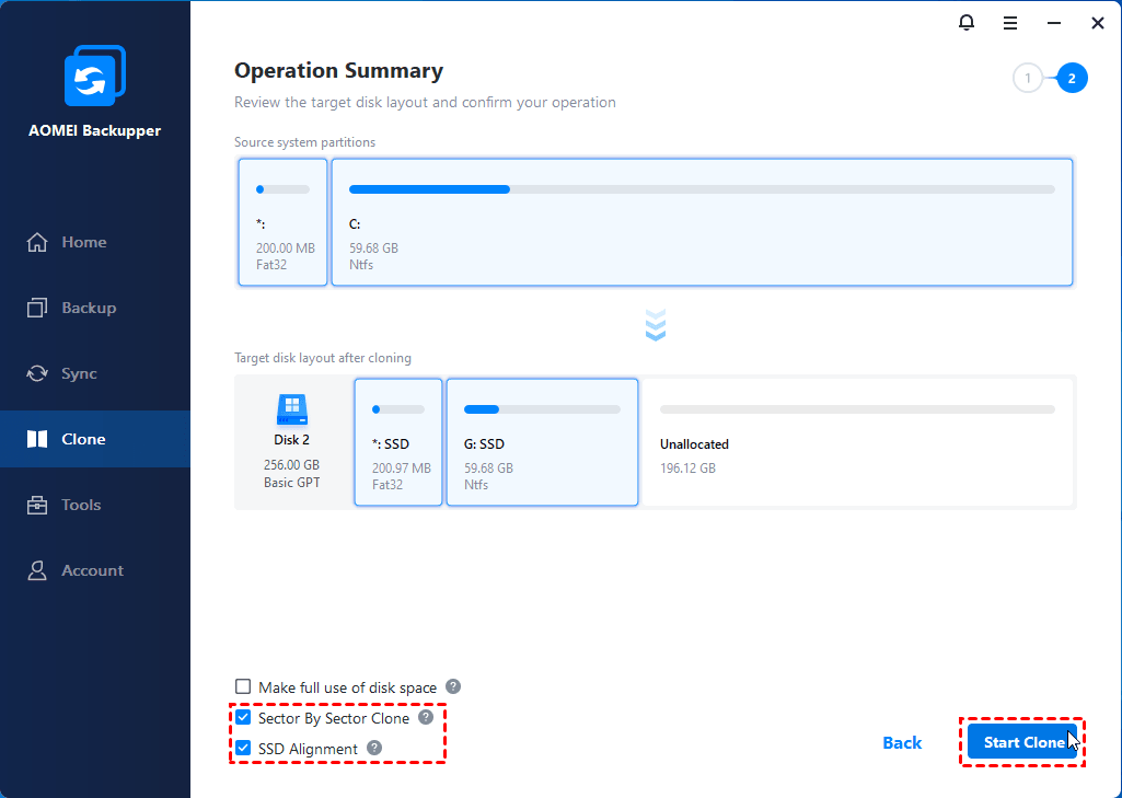 Step 3. Confirm your operation and check SSD Alignment (recommended). Optionally, you can use Sector by Sector Clone to clone all sectors of system partition. Afterward, click Start Clone to begin system cloning.