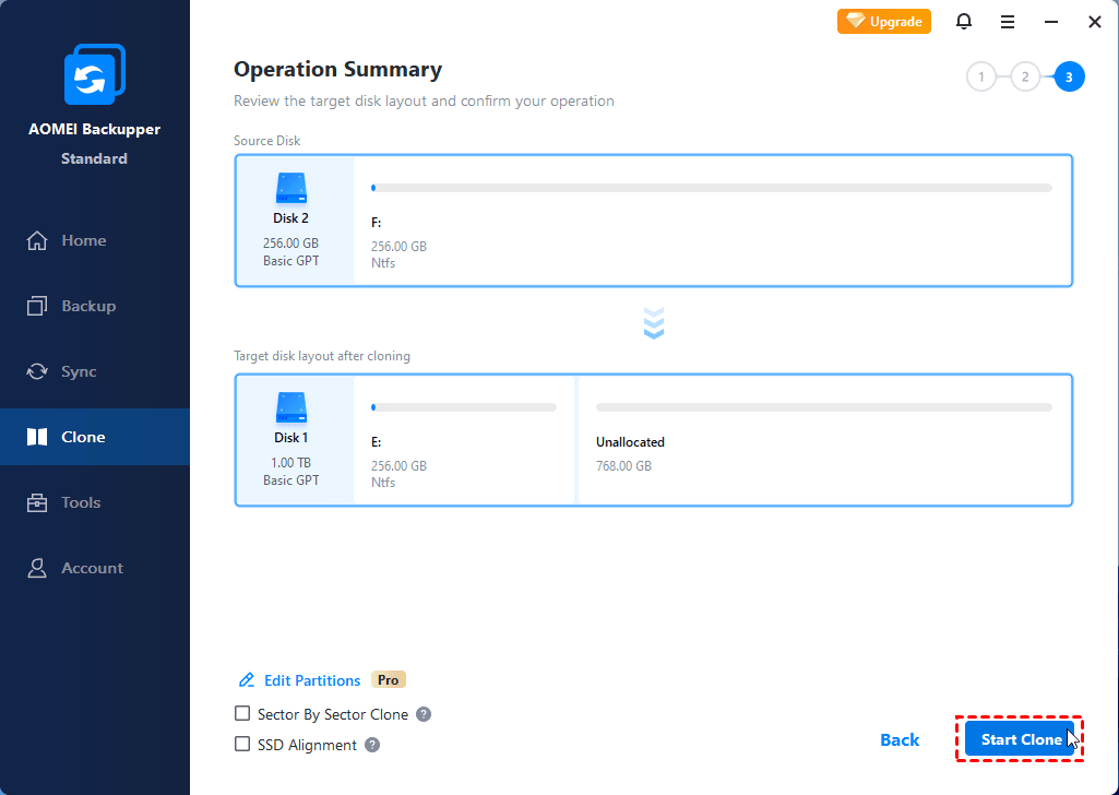 Step 4. Check SSD Alignment to accelerate the writing & reading speed of SSD when cloning to SSD. Then, click Start Clone to clone USB drive on Windows 10/11 hassle-free.