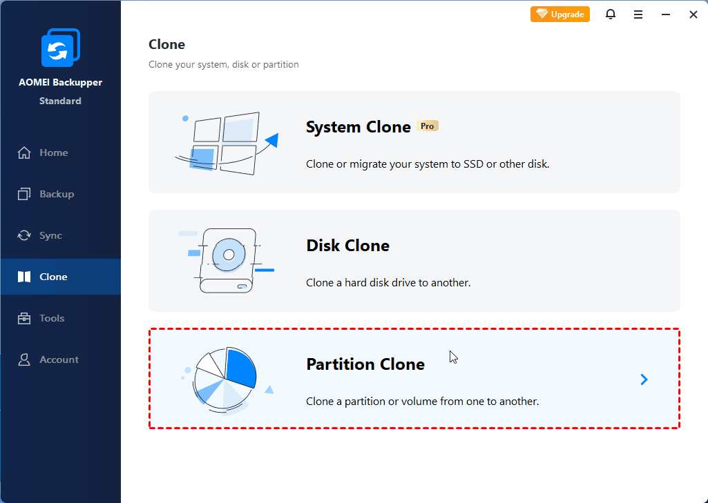 AOMEI Backupper is a professional and powerful free cloning software that offers Partition Clone as well as Disk Clone. You can use it to copy a single partition or entire disk with one click.