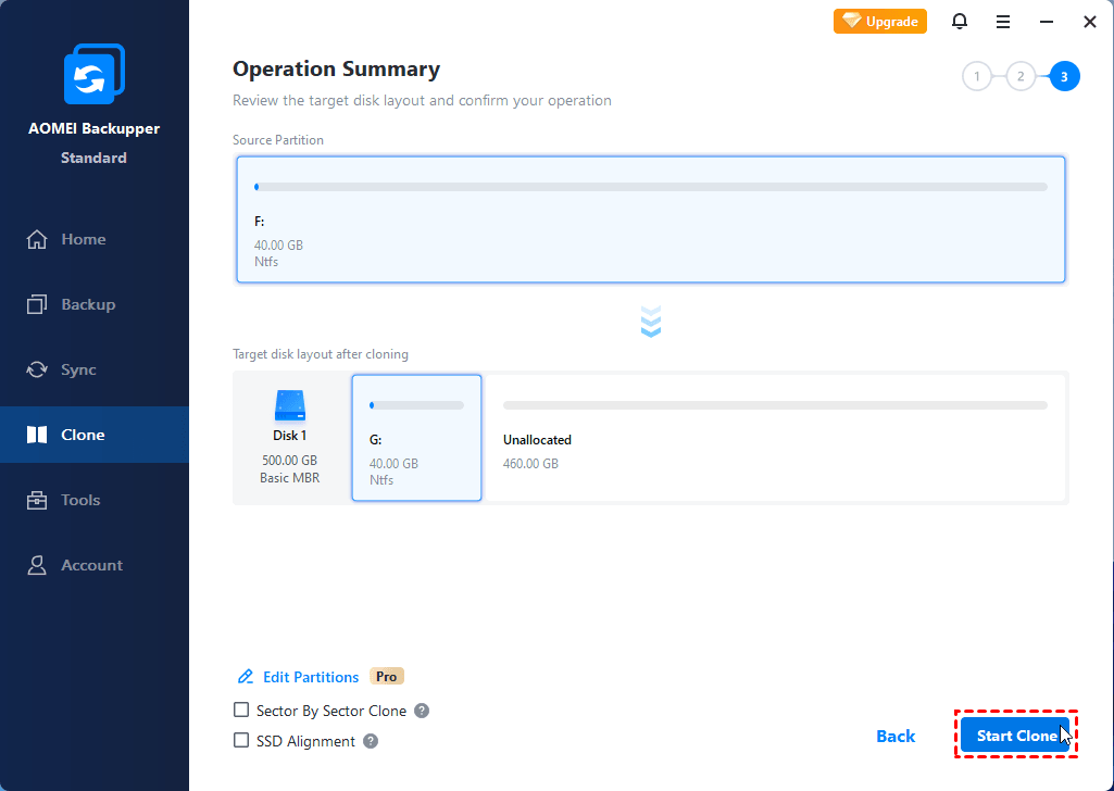 Step 5. Tick SSD Alignment if cloning to an SSD. Then, click Start Clone.