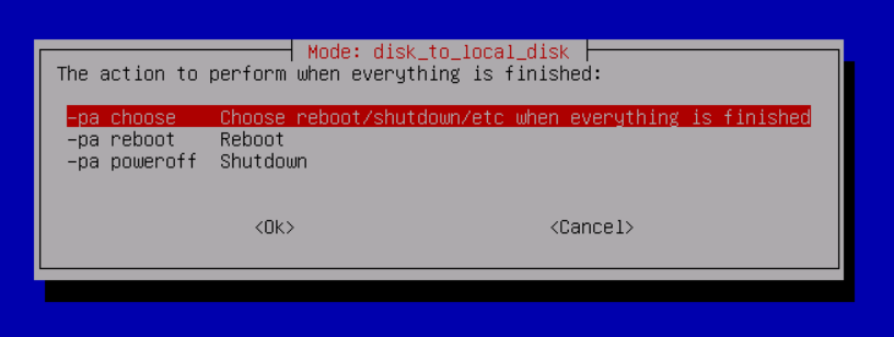 8. Choose the action to perform after the cloning. The default option is Choose reboot/shutdown/etc when everything is finished.