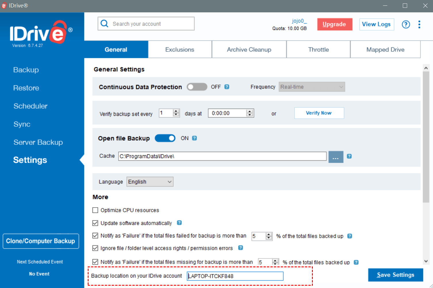 Step 6. Go to Settings on the main homepage to check or modify the backup location on your IDrive account.