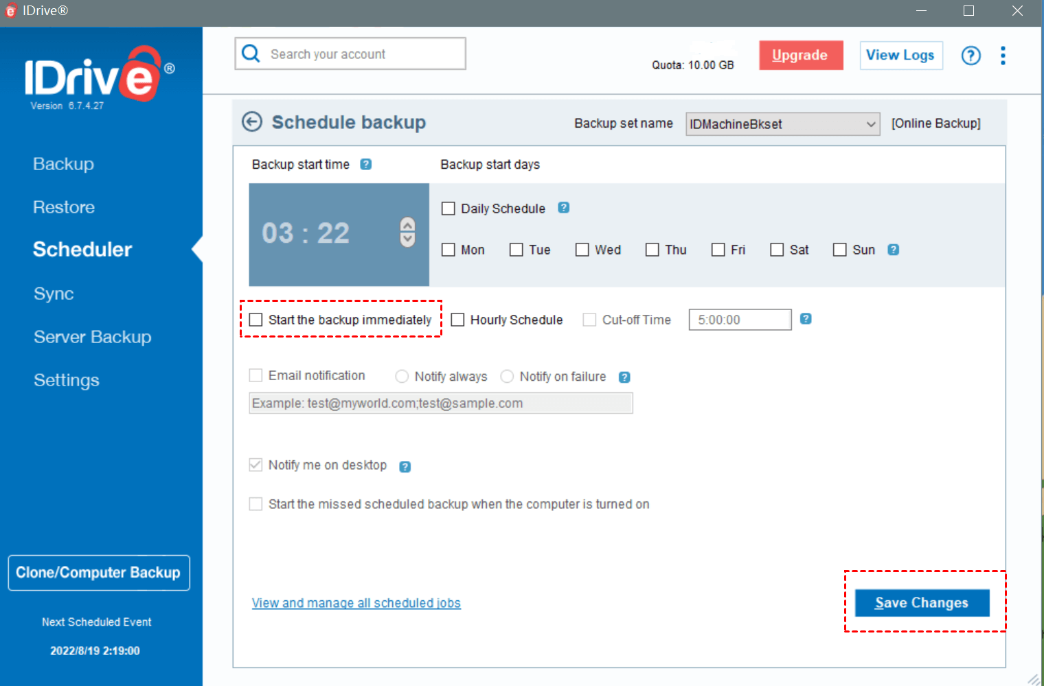 Step 5. The Schedule Backup page will pop up. Create a schedule for performing regular entire machine backup or you can Start the backup immediately, and click Save Changes.