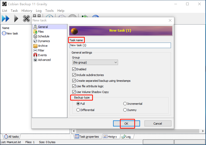 Step 2. Change the Task Name as you like. You should leave all the other options on that page the same except the Backup type. Choose one Backup type by your needs. Then click OK.