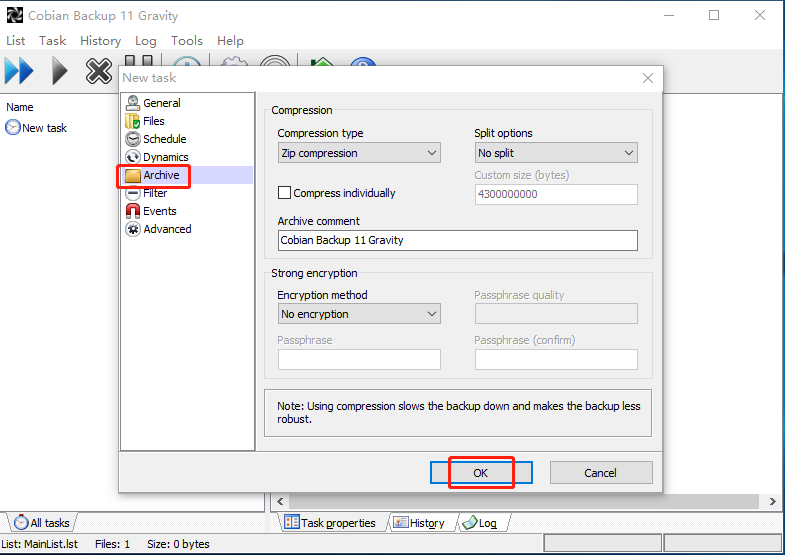 Step 3. If you want to use compression when creating backups, you can select Archive from the left hand menu of the New Task dialog. ZIP compression is highly recommended as it will save you a great deal of hard drive space. Then click OK.