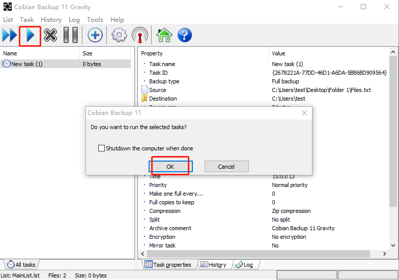Step 5. You will be back at the main interface. Click the triangle icon to start your backup task. Then click OK to confirm.