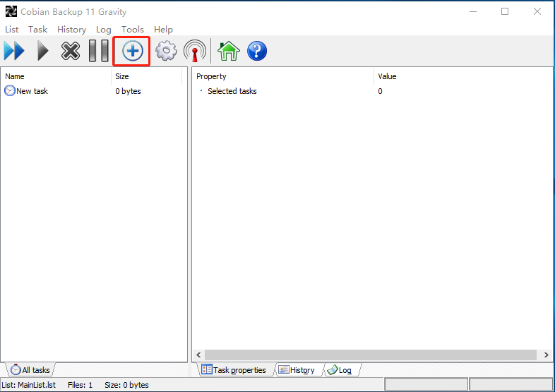 Step 1. Install and open Cobian Backup. Click plus sign icon on the main ribbon bar of the program to create a new backup.