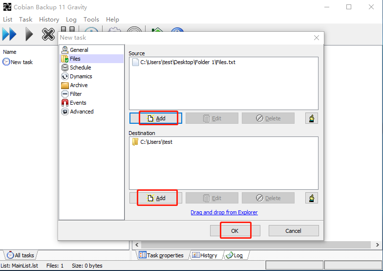 Step 4. Once you have configured your archive settings, please click Files. Choose Add tab in the Source category to select the files and folders you wish to backup. Choose Add tab for the Destination section to select the destination path. Then click OK.
