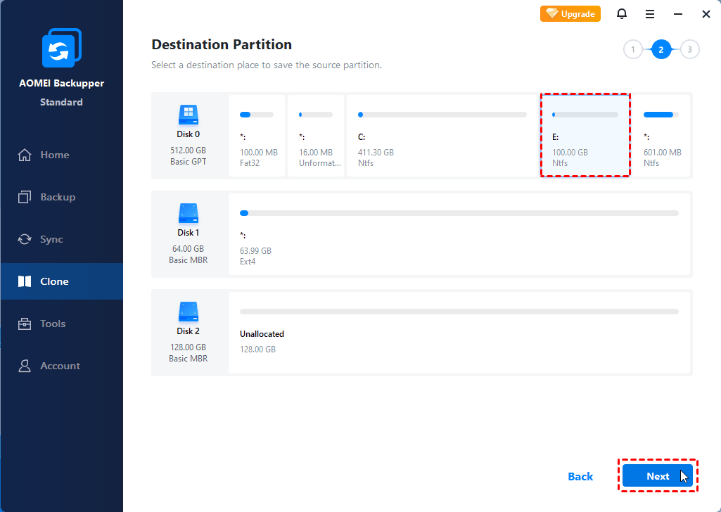 Step 3. Select another drive as the destination partition and click Next. You are able to clone to a local drive or an external drive.