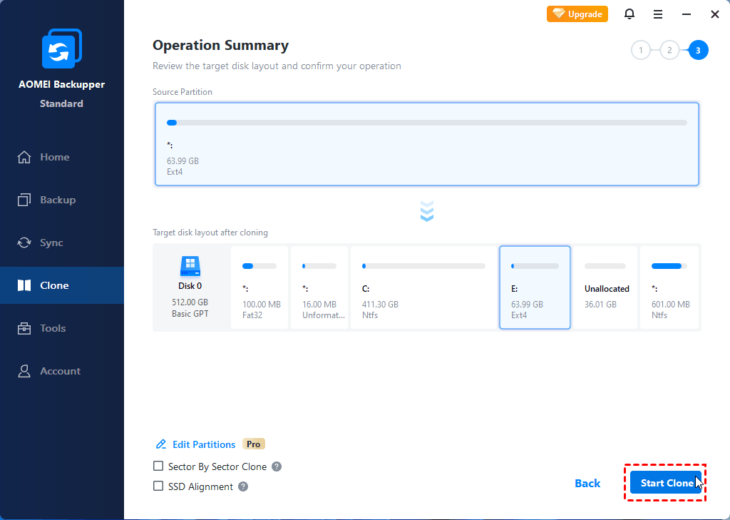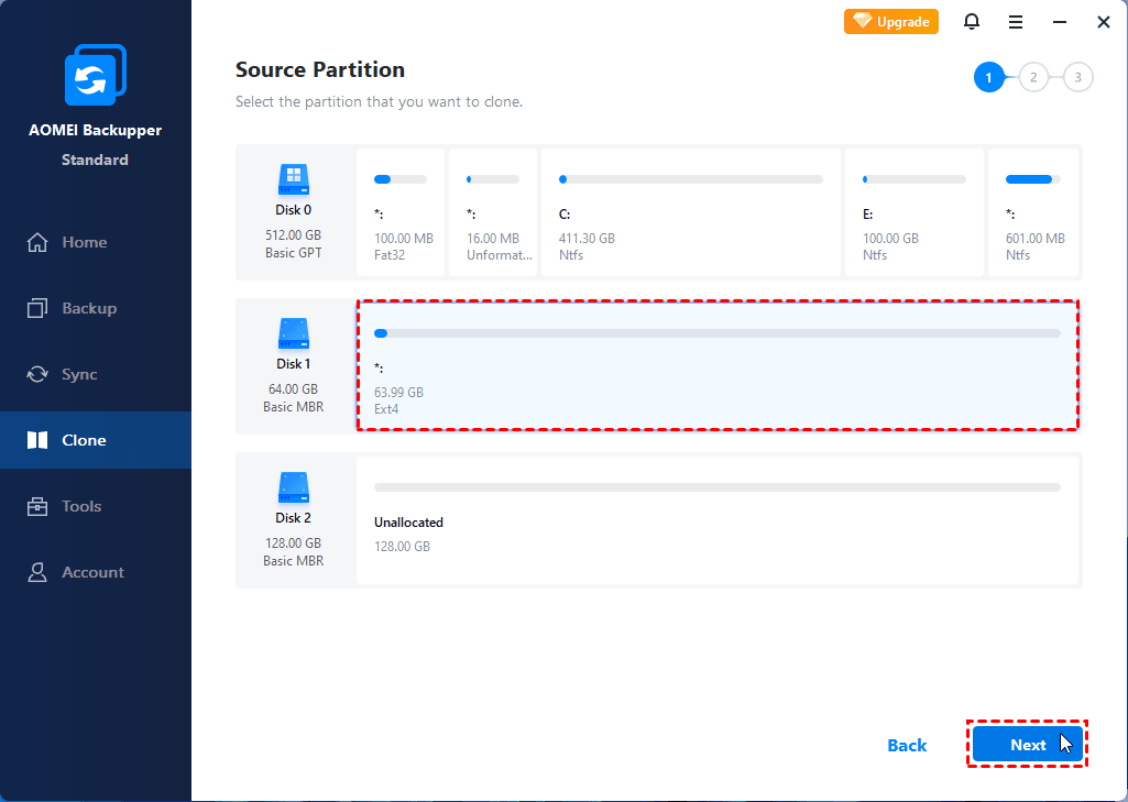 If you need to clone the whole hard drive which includes an Ext4 partition, you can use the Disk Clone feature. You are also allowed to clone larger HDD to smaller SSD or clone NVMe SSD to another NVMe SSD and so on.