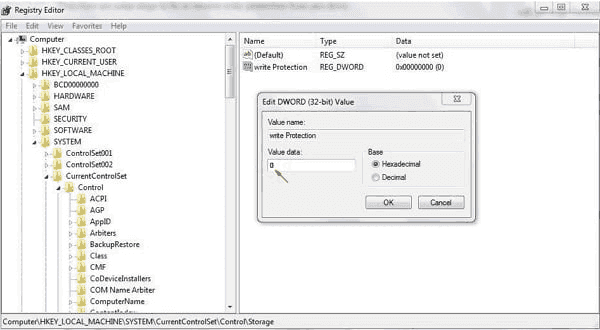- If write protection is set to 1, double-click it and change the value to 0 to remove copy protection for USB flash drive.