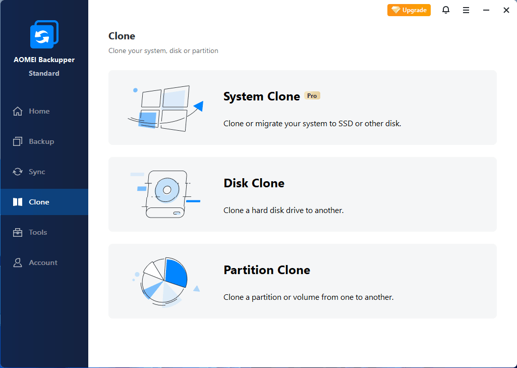*The Disk Clone function in the Standard version is only available to copy data drive. If you need to clone/copy a system drive or system-related partitions, please upgrade to the Professional or higher editions.