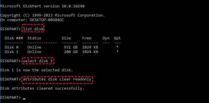 - Type attributes disk clear read-only and press Enter to remove write protection.