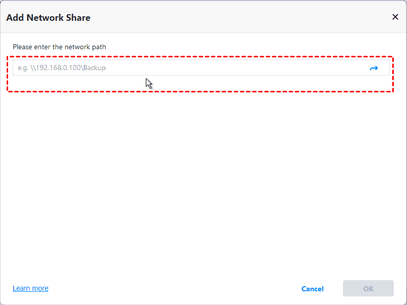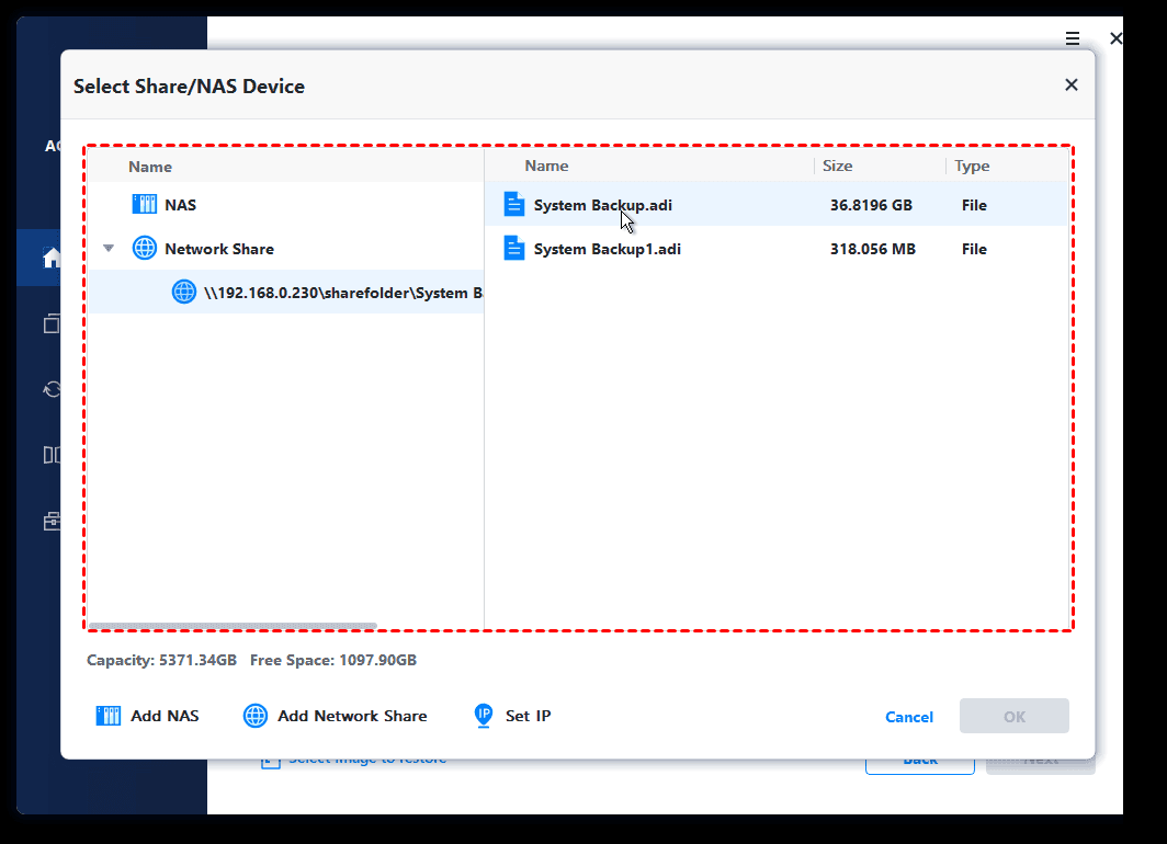 Step 3. In the pop-up window, select Share/NAS > Add Share or NAS Devices. Then, type the network path for the system image and click OK.