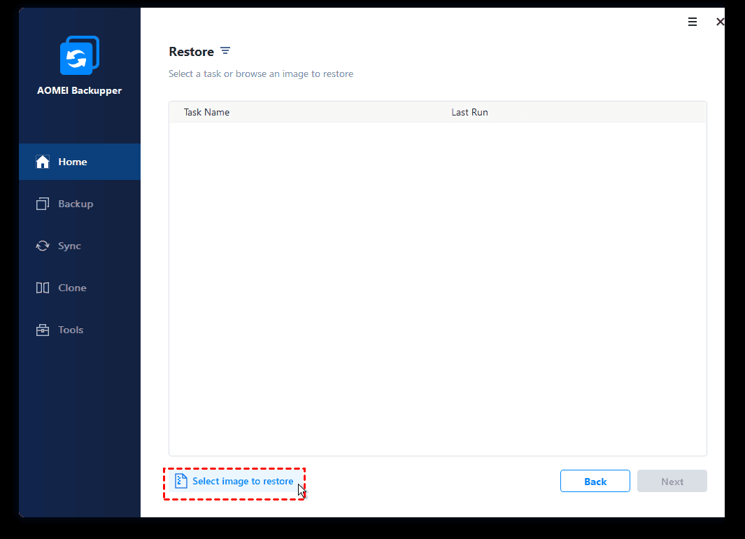 Step 2. AOMEI Backupper will load automatically. Click Restore and then Select Image File.