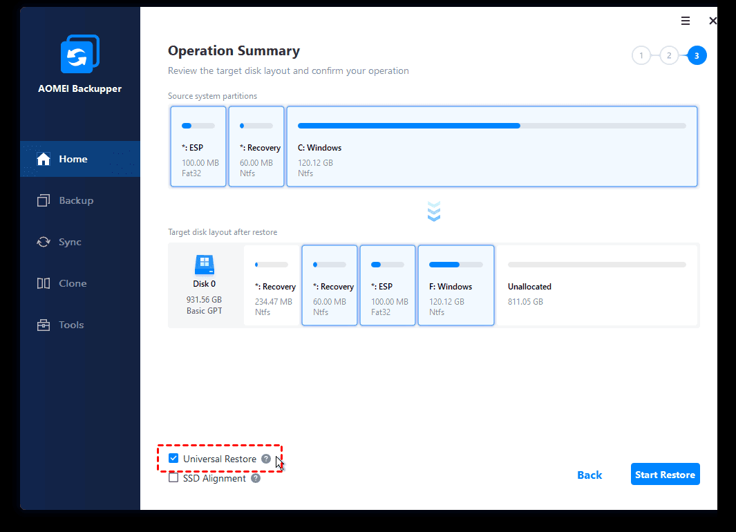 Step 7. On the “Operation Summary” page, tick Universal Restore to ensure a secure boot. Then, click Start Restore to begin.