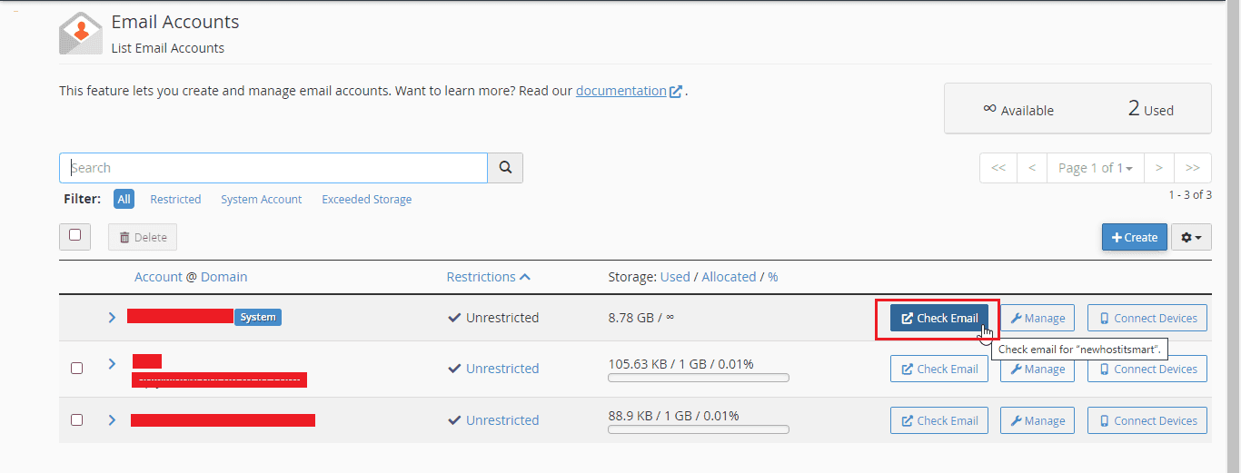 Step 2. You’ll find all the emails linked to your cPanel account on this page. You can also find three buttons, namely, Check Email, Manage, and Connect Devices, corresponding to each email. Click on the Check Email button in front of the email address you wish to backup.