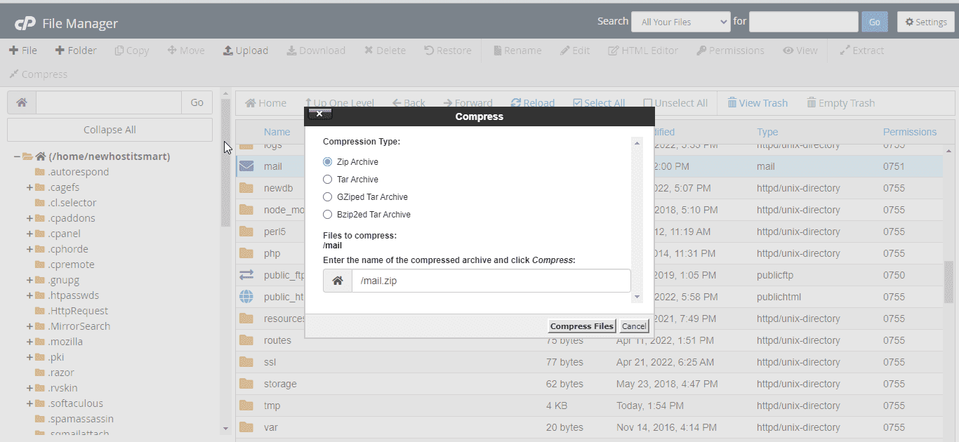 Step 4. Right-click on the Mail option, look for the Compress option, and select it. There are various types of compression extensions like .zip, .tar, .tar.gz, .tar.bz2.