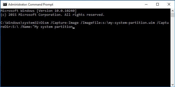 Dism /Capture-Image /ImageFile:s:\my-system-partition.wim /CaptureDir:S:\ /Name:"My system partition"