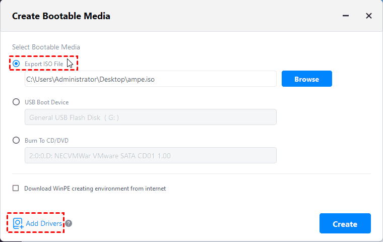 A: In the "Select Bootable Media" dialog box, choose "Export ISO File" instead of "Burn To CD/DVD" or "USB Boot Device" to create an ampe.iso file, and then burn the ISO file to USB, CD, or DVD via third-party burning tools.