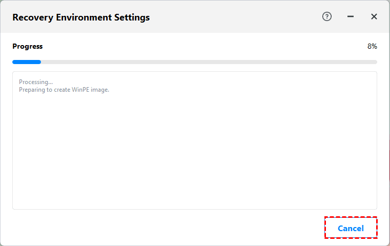 It will enter the page for creating the recovery environment. In this page, you can check the progress of creating the recovery environment and specific process information. You can click "Cancel" in the lower right corner to stop the process of creating a recovery environment.
