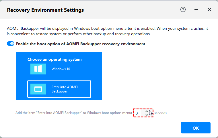 After enabling this option, the "AOMEI Backupper Recovery Environment" option will be added to the system boot menu page, so that you can select to start the system from the recovery environment.