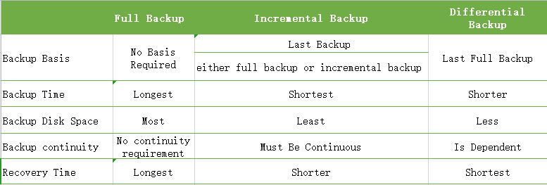 As you can see from the table above, the 3 backup types has differences in backup basis, backup time, backup disk space, backup continuity, recovery time. But in the following, I will only introduce the backup continuity, as other aspects have been mentioned in the previous introduction.