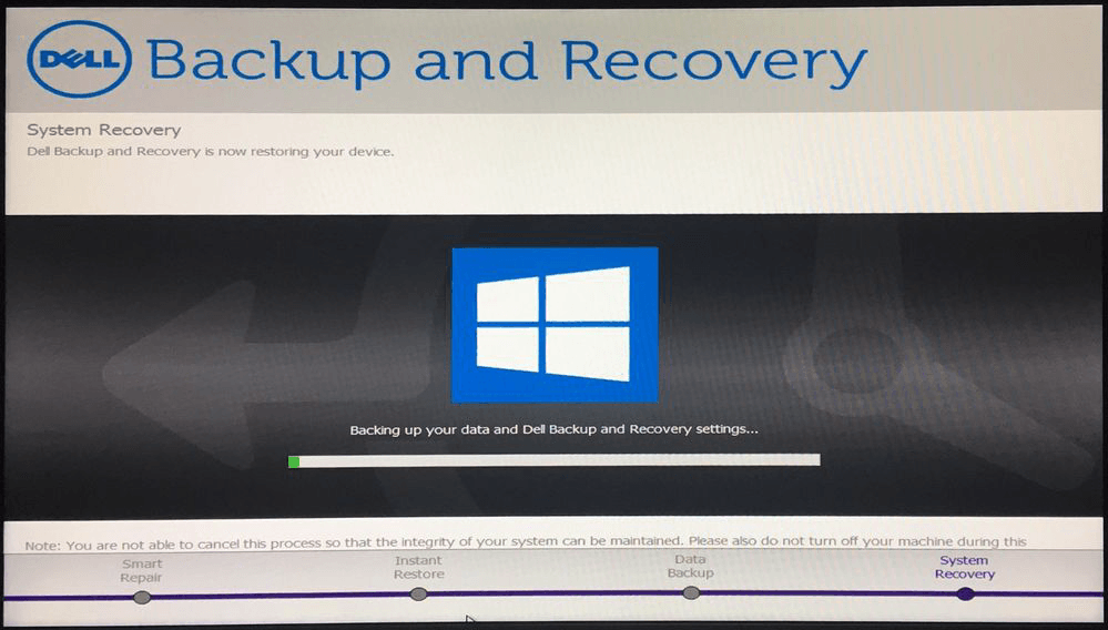 The process has now been 'stuck' on the screen below for over a day, saying “Backing up your data and Dell Backup and Recovery settings...”. There is no indication that the XPS 8700's hard drive is doing anything and the pane only indicates it is past "Data Backup" and now at "System Recovery". Is it the recovery process really slow? If it stuck, what should I do?”