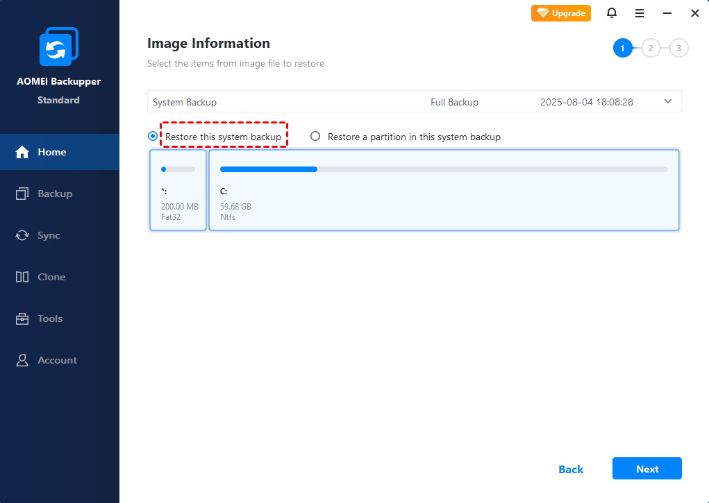 Step 4. Select system image listed in the following picture and click Next. If your image is on the external disk, please connect it first.
