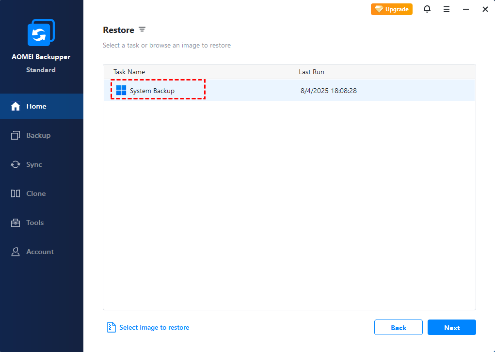 Step 3. Wait until the backup process ends. Click Restore and Select Task.