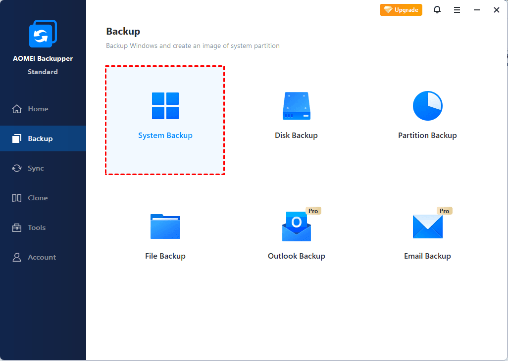 Step 1. Launch AOMEI Backupper Standard, and click Backup and System Backup in order. Then, it will automatically select the system partition and boot related partitions required to start Windows.